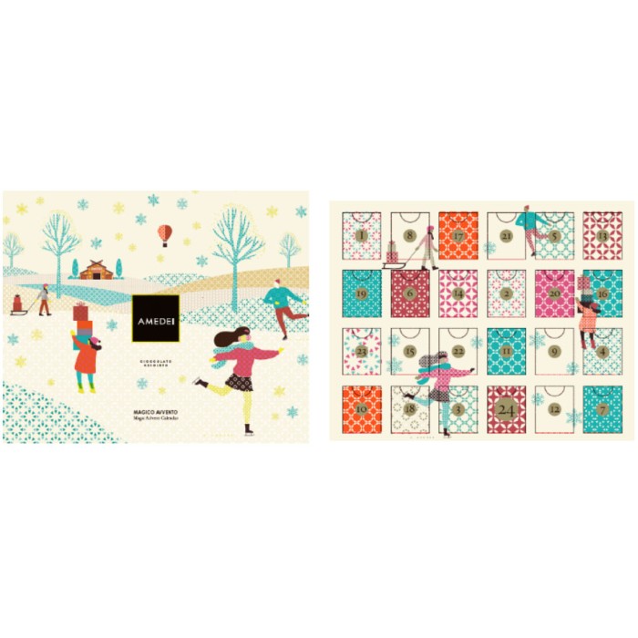 Stilfull adventskalender från italienska Amedei, choklad tillverkad bean-to-bar i hjärtat av Toscana! Innehåller totalt 48st chokladfigurer mixat vit, ljus och mörk choklad. Magi i varje lucka!