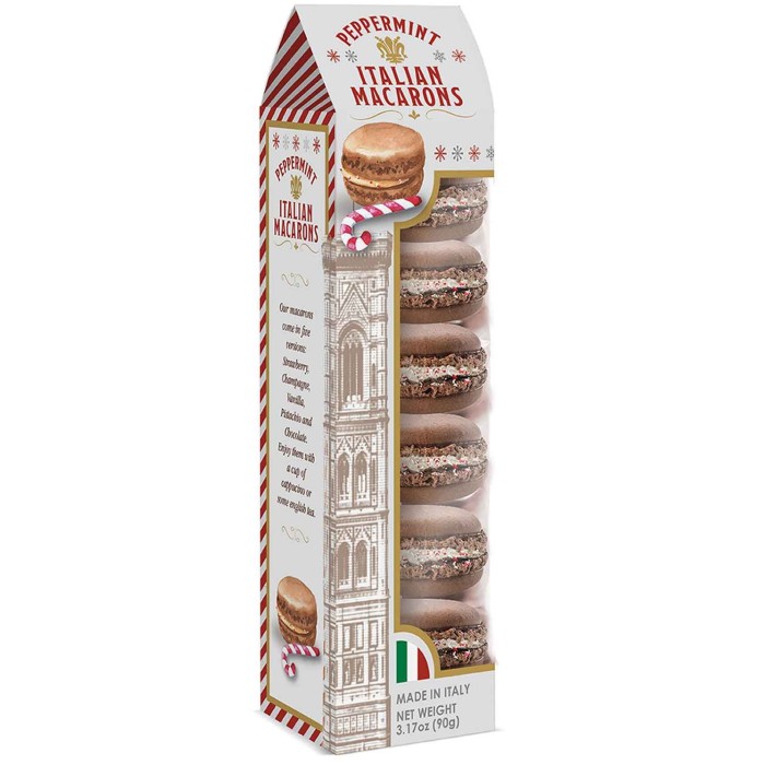 Läckra italienska macarons bakade på mandelmjöl, socker och äggvita - en klassiker som går tillbaka till renässansen. Den spröda marängen fylls här med en pepparmintscrème som ger en elegant balans mellan sötma och fräsch mint. Perfekta som en lyxig detalj till kaffet, som gåva eller för att unna sig något extra.