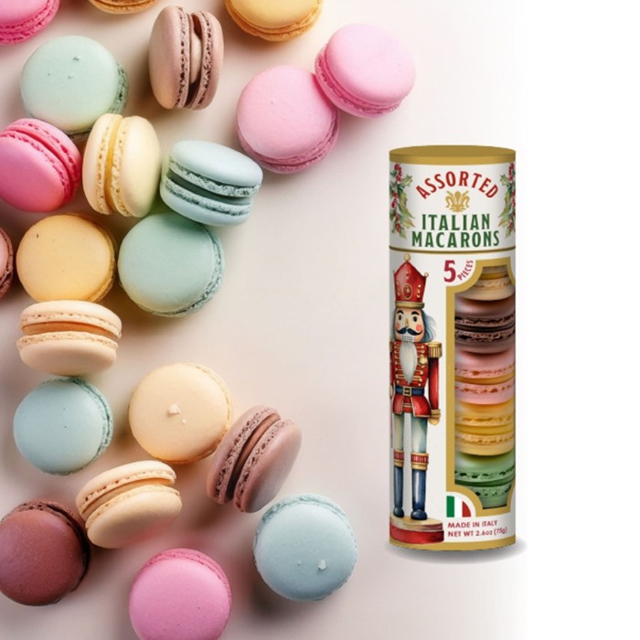 En festlig julburk med Nötknäppar-motiv fylld av läckra italienska macarons i fem olika smaker: citron, pistage, vanilj, jordgubb och choklad. Varje macaron är styckförpackad för att behålla fräschören och göra dem enkla att bjuda på. En vacker burk som kombinerar julstämning med klassiska italienska bakverk.