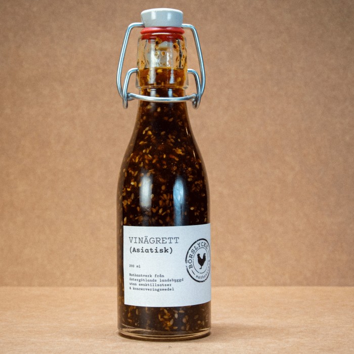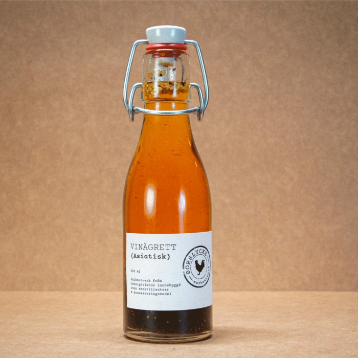 Börslycke Gård Asiatisk Vinägrett är en hantverksmässigt tillverkad vinägrett skapad i liten skala med stort fokus på smak och kvalitet. I producentens kök tillverkas vinägretten med omsorg och respekt för råvarorna, helt utan tillsatser.