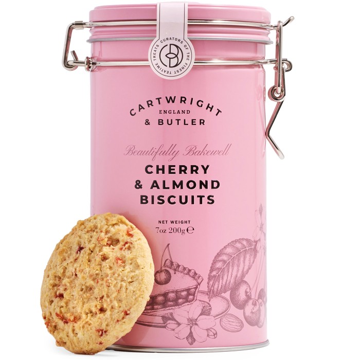 Cartwright & Butler Plåt Cherry & Almond Biscuits är klassiska brittiska småkakor bakade med generösa mängder smör, glaserade körsbär och finmald mandel. Resultatet är spröda, smakrika kakor som smälter i munnen och passar perfekt till en kopp te eller kaffe. Förpackade i en elegant rosa plåtburk som gör dem lika fina att ge bort som att njuta av själv. En lyxig och oemotståndlig kombination av sötma och nötig arom.