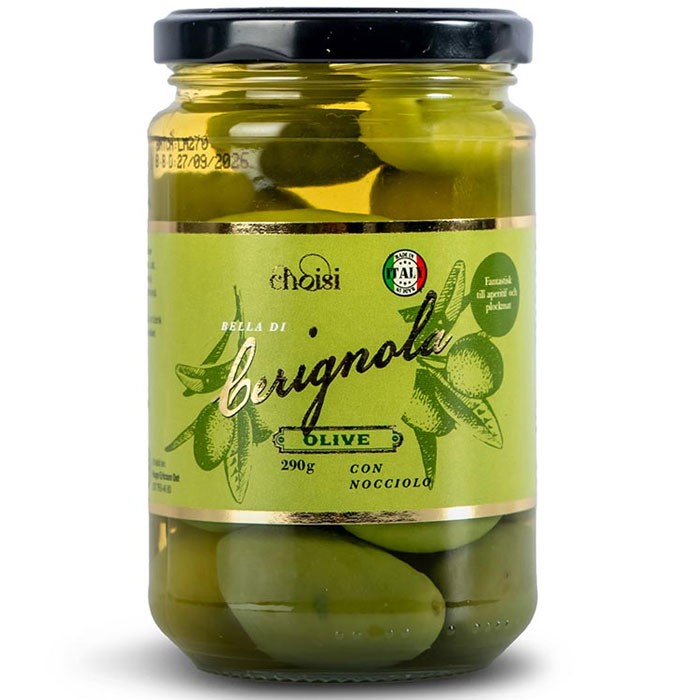 Cerignola är en av Italiens största och mest ikoniska olivsorter, känd för sin imponerande storlek, klara gröna färg och milda, lätt smöriga smak. Dessa Cerignolaoliver från Choisi har kärnan kvar, vilket ger en fastare konsistens och extra saftighet vid varje tugga.