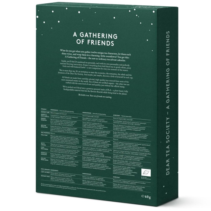 Vad får du när du samlar 12 unika tekaraktärer, låter dem glänsa två gånger var och förpackar dem i en charmig nedräkning? Svaret är A Gathering of Friends - den inte-så-vanliga te-adventskalendern.