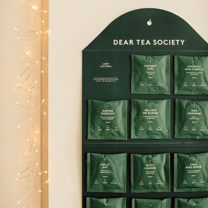 Inuti hittar du en hängare med 24 numrerade tepyramider, var och ett med sin egen personlighet och noggrant anpassade brygginstruktioner. Här väntar allt från kraftfulla svarta teer till mjuka vita, saftiga frukter och välbalanserade örter - en ny följeslagare för varje te-tillfälle under december.