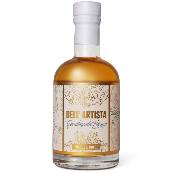Condimento Bianco är Dell' Artistas variant av Balsamico Bianco, kokt vit druvmust och fin vitvinsvinäger på de bästa råvarorna för säsongen, lagrad på ekfat i Modena. Den fina konsistensen, gyllene färgen och den snyggt balanserade smaken mellan söt, fruktigt och syrligt kännetecknar den fräscha matkärleken av Italien.