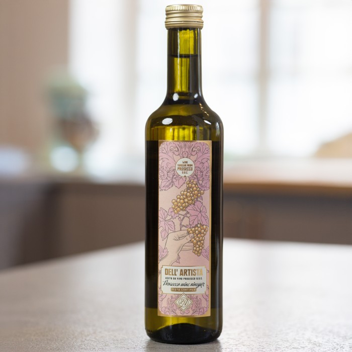 Dell'Artista Proseccovinäger är en exklusiv vinäger gjord på Prosecco D.O.C. vin, som ger en rundare och mjukare smak till dina kreationer än en vitvinsvinäger. Fantastisk för att höja dina rätter till nya nivåer. Väldigt användbar dagligen i köket där vinägern passar när man behöver smaka upp sin mat med lite fin och lyxig syra.