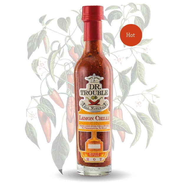 Dr Trouble Lemon Chilli Sauce är en unik och prisbelönt chilisås som kombinerar frisk citrus med en elegant och balanserad hetta. Såsen görs på 100 % ren juice från vildväxande citroner i Zimbabwe, vilket ger en naturlig syra och en fräsch smakprofil som skiljer sig från traditionella vinägerbaserade chilisåser.
