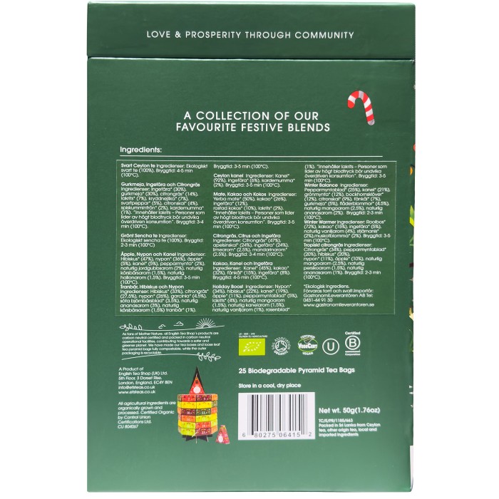Denna kalender presenteras som en julgran med numrerade pyramidaskar, fyllda med en härlig mix av utvalda smaker från ordinarie sortiment och säsongsutbudet.