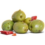 Knäckta gröna oliver, vatten, olivolja, RÖD PAPRIKA, VITLÖK, vinäger, smakförstärkare (E621 & E635), surhetsreglerande medel (E300), aromer, kryddor, mineralämnen, (zinklorid och kopparsulfat), innehåller SULFAT & spår av FISK, NÖTTER och SENAP.