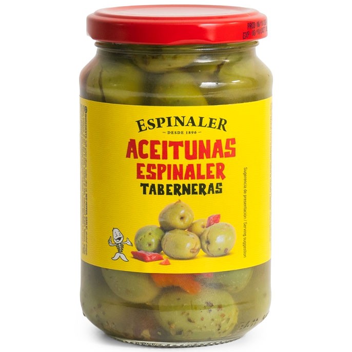Espinaler Taberneras-oliver är läckra oliver i Selecta-kategorin gjorda med knäckta gröna oliver. Noggrant utvalda och kryddade. Espinaler Taberneras-oliver har smaken och kvaliteten som är karakteristisk för de finaste oliverna från århundraden gamla medelhavskrogar.