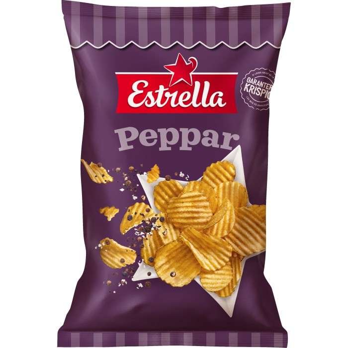 Estrella Pepparchips är krispiga grovräfflade potatischips med smak av salt och svartpeppar. En klassiker i chipshyllan sedan 1975. Dessa chips bjuder på en kraftfull pepprig smak med härlig intensitet och den grova räfflingen gör chipsen optimala att dippa. Direkt från chipsfabriken i Göteborg gjorda på naturliga råvaror med mycket smak - och dessutom veganvänlig. Krispig helg!