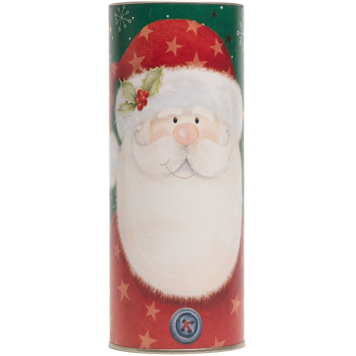 Presenttub med tomtemotiv. Innehåller goda engelska kakor med bitar av choklad.