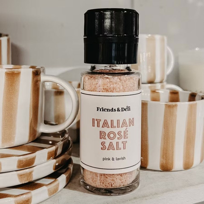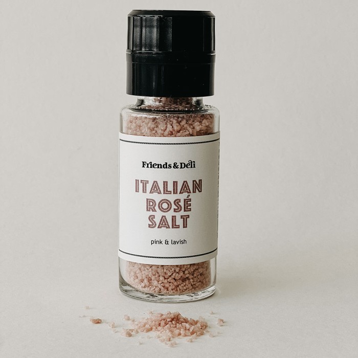 Sälta med rosédrömmar! Det här havssaltet är infuserat med rosévin från italienska Syrah-druvor - och ger en subtil rundhet, vacker färgton och en känsla av semester i varje nypa. Ett vackert rosaskimrande havssalt Det ger en mild och rund smak med en elegant touch, perfekt att strö över grillade grönsaker, kyckling, vilt eller sallader precis innan servering. Friends & Deli tillverkar det för hand, i små upplagor, med naturliga råvaror och kärlek till det enkla.