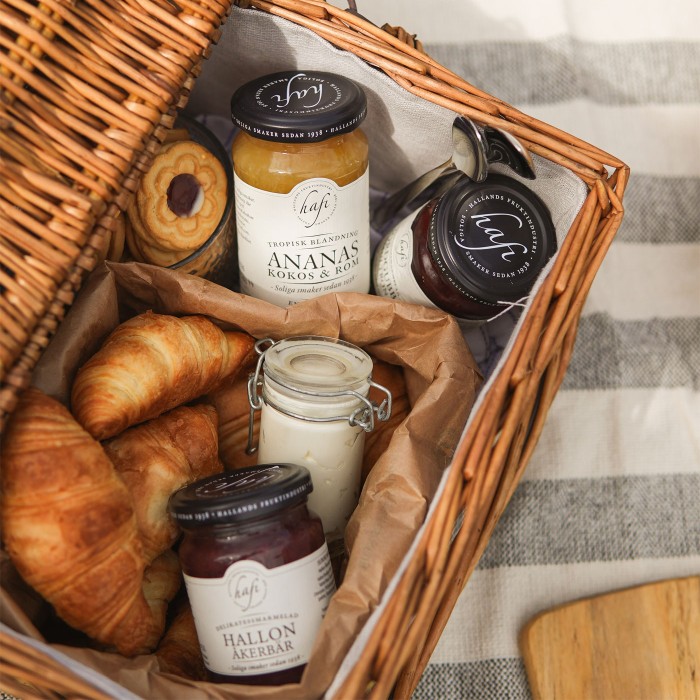 Ananas (50%), Socker, Kokos (4%), Citronjuice, Aromer, Förtjockningsmedel (pektin), Konserveringsmedel (kaliumsorbat). Fruktmängd: 54 g per 100 g.