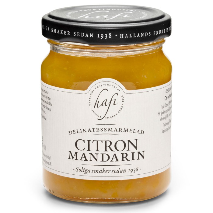 Frukt (Citron 30%, Mandarin 30%), Socker/Sukker, Förtjockningsmedel (pektin), Naturlig citronolja, Konserveringsmedel (kaliumsorbat). Fruktmängd: 60 g per 100 g.