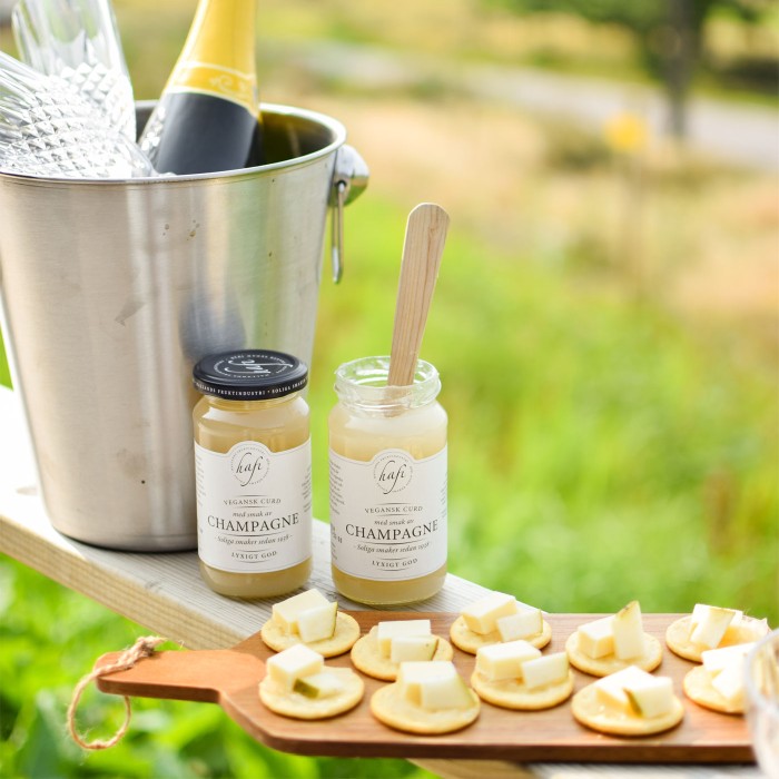 Hafis veganska Curd med smak av Champagne är ett lyxigt tillbehör som sätter guldkant på ostbrickan och är ett måste på söndagsbrunchen. Passar utmärkt som fyllning i tårtor och bakverk men även som topping på pannacotta.