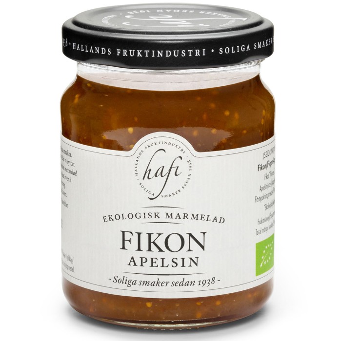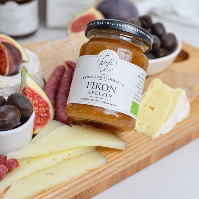 Fikon passar utmärkt till dessertostar. Hafi har tillfört lite apelsin för att ge marmeladen en svag citruston. Ha den till ost, glass, färsk frukt, i naturell yoghurt, såser och dressingar.