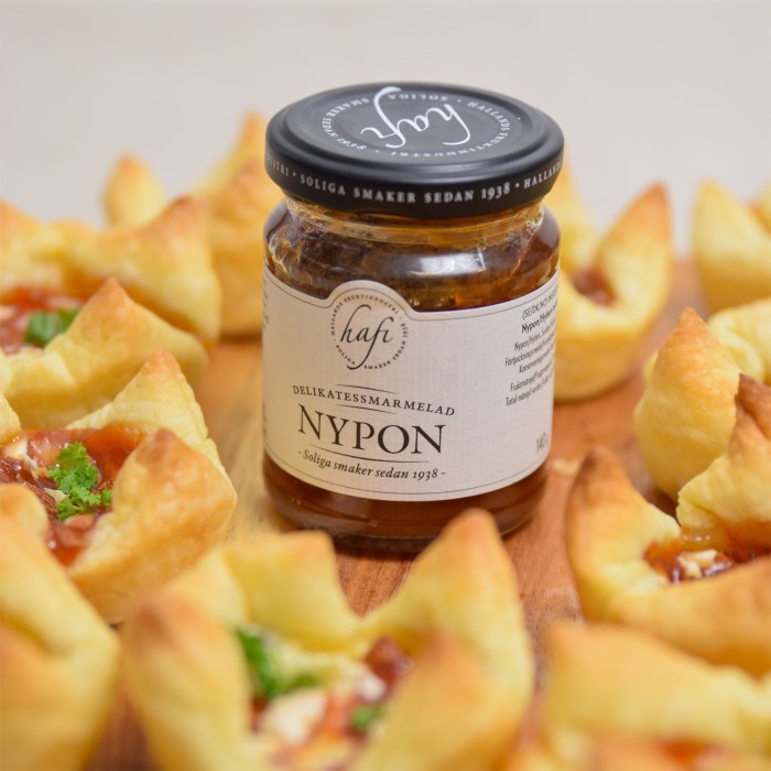 Nypon, Socker, Citronjuice, Förtjockningsmedel (pektin), Konserveringsmedel (kaliumsorbat). Fruktmängd: 50 g per 100 g. Energi 850 kJ/200 kcal Fett <0,5 g varav mättat fett <0,5 g, Kolhydrat 50 g varav sockerarter 48 g, Protein <0,5 g, Salt <0,5 g