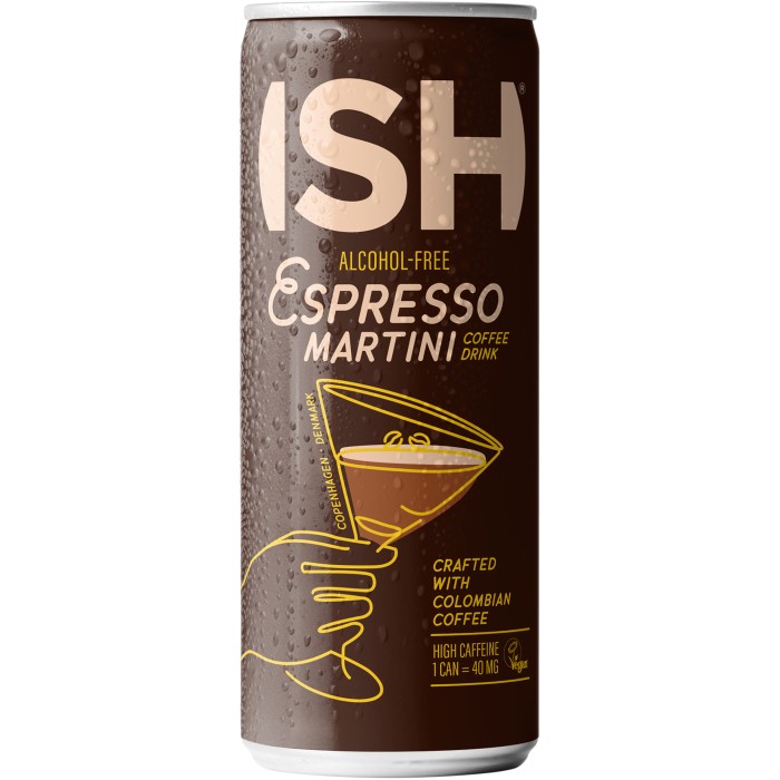 ISH Espresso Martini är en alkoholfri tolkning av en av vår tids mest populära cocktails - Espresso Martini. Den här moderna klassikern är älskad för sin tydliga, rostade kaffesmak, sin mjuka sötma och sin stilrena “cocktailkänsla”, och passar lika bra för kaffeälskare som för dig som vill ha en vuxen drink utan alkohol.