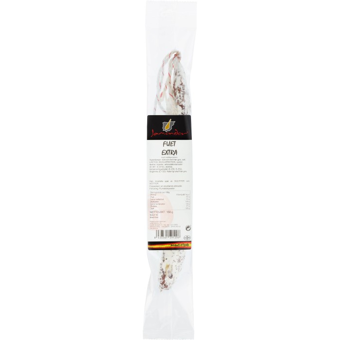 Jamondor Fuet Extra är en klassisk spansk fuetsalami med balanserad sälta och en mild, fyllig smak. Den lufttorkas varsamt för att utveckla sin karakteristiska arom och fasta men mjuka konsistens. Perfekt att skiva tunt och njuta som snacks, på tapasbrickan tillsammans med ostar och oliver eller som smakrik ingrediens i matlagningen. En riktig favorit bland älskare av spansk chark.