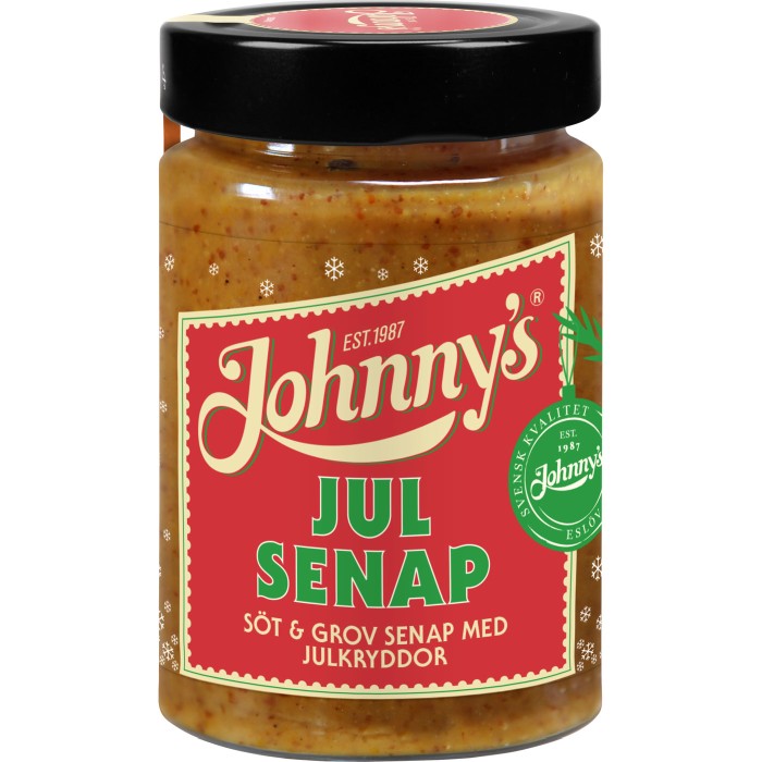 Johnny’s Julsenap är en härligt kryddig senap som passar extra bra till julens läckerheter! Senapen är mycket smakrik med kittlande frisk syra i eftersmaken. Passar till julbordets fröjder och då i synnerhet julskinkan och laxen. Johnny's Julsenap är även god att glasera revbensspjäll med eller som tillbehör till ugnsbakad selleri. Våga prova senapen till osbrickan.