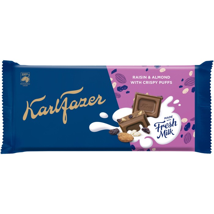 Sammetslen mjölkchoklad tillverkad av färsk mjölk, knaprig mandel och söta russin med krispiga vetepuffar. Karl Fazer mjölkchoklad är en älskad chokladklassiker som har fått sin unikt fylliga smak av bästa möjliga råvaror alltsedan 1922.