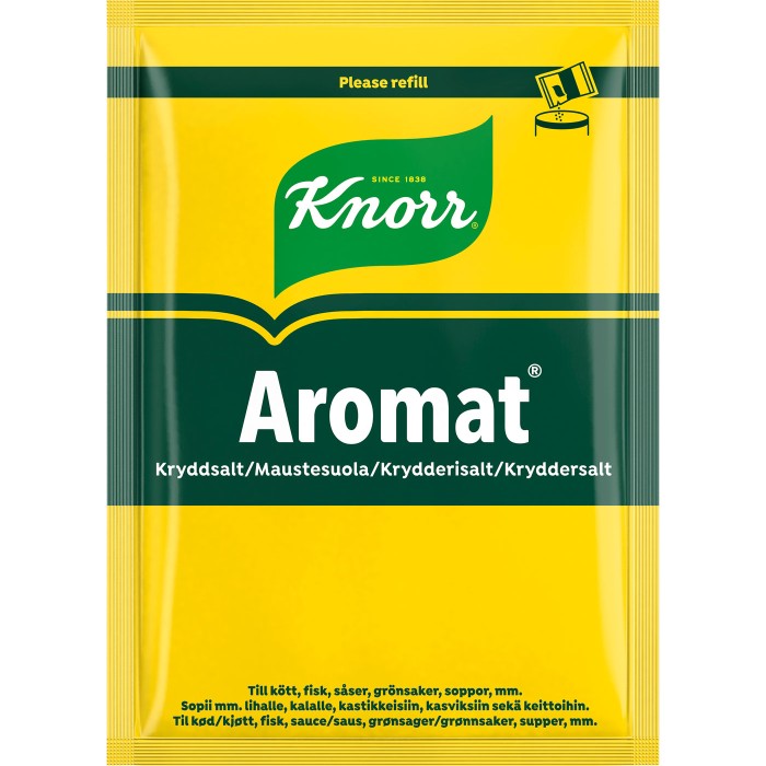 Knorr Aromat Kryddsalt passar utmärkt till kött, fisk, såser, grönsaker, soppor med mera. Den lockar fram den goda smaken i den goda maten! Strö Knorr Aromat Kryddsalt på en smörgås med färskost och grönsaker – enkelt och jättegott. Krydda torsk eller lax med Knorr Aromat Kryddsalt, slå på lite grädde och gratinera i ugnen. Sugen på att prova en ny smakkombination? Prova att blanda Knorr Aromat Kryddsalt med finhackad färsk rosmarin och timjan, havssalt och en skvätt olivolja som som smaksättare till kött, fisk och grönsaker.