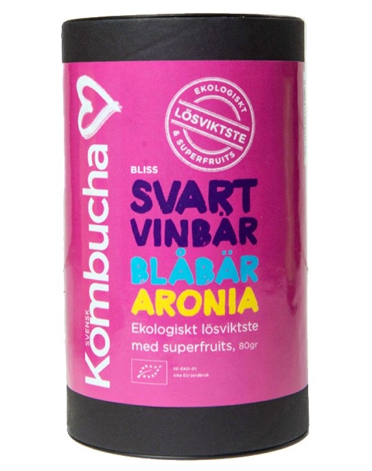 Kombucha Bliss är ett ekologiskt te med en blandning av svart, grönt och rött te. Kombucha Bliss innehåller även svartvinbär, blåbär och aroniabär.