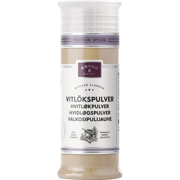 Kryddhuset Vitlökspulver i PET-Burk ger en intensiv och fyllig vitlökssmak som tillför djup och karaktär i matlagningen. Den är enkel att använda och passar i många olika typer av rätter. Perfekt i såser, marinader och kryddblandningar där du vill ha en jämn och rund vitlökssmak.