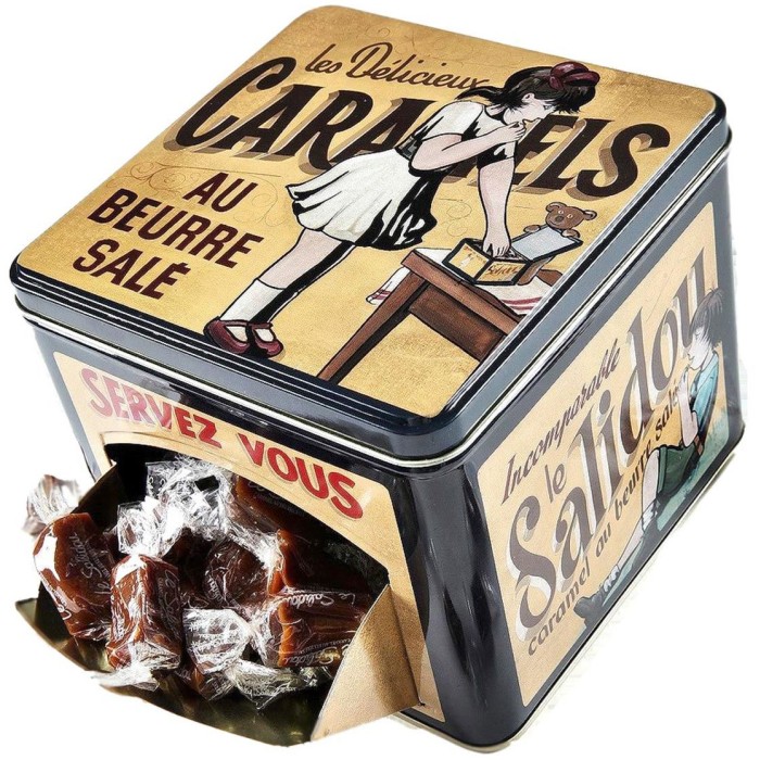 En vacker retroinspirerad metallburk fylld med klassiska franska smörkolor med havssalt från Maison Armorine. De lena, gyllene kolorna är gjorda på smör, socker och det finaste havssaltet från Guérande, en perfekt balans mellan sötma och sälta.