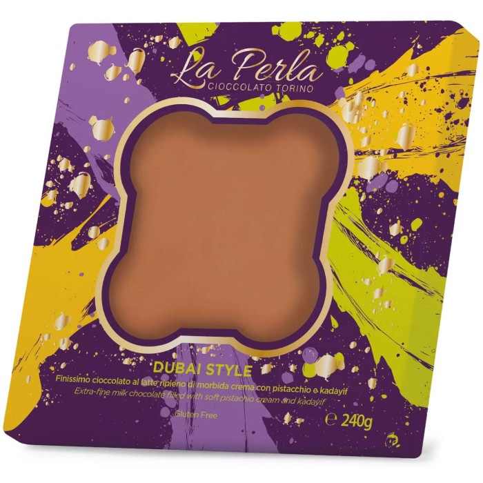 La Perla Dubai Style Chokladkaka är en exklusiv glutenfri chokladkaka med mjölkchoklad och en generös fyllning av pistagekräm, kadaiyf och pistagenötter. Kombinationen ger en tydlig pistagesmak tillsammans med ett härligt krispigt inslag.