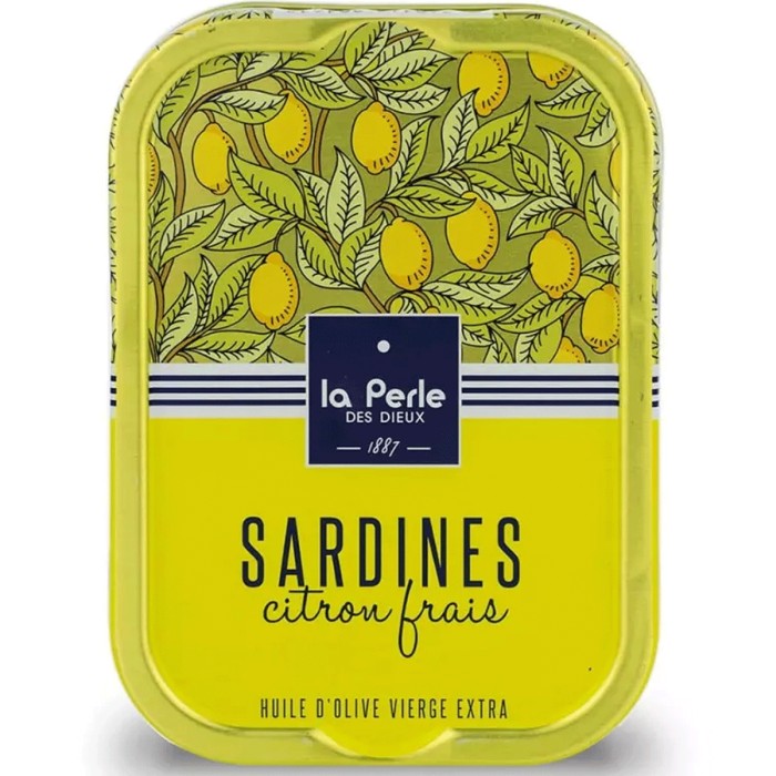 La Perle des Dieux Sardiner i Extra Jungfruolivolja & Citron är en elegant fransk delikatess där havets sälta möter frisk citrus. Sardinerna handpackas i Saint Gilles Croix de Vie, en kuststad känd för sin långa tradition av sardinkonserver och hantverk.