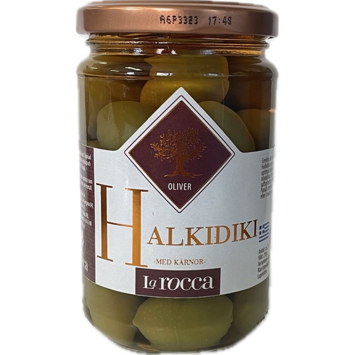 La Rocca Halkidiki Oliver är stora, gröna oliver kända för sin fasta konsistens och milda, fräscha smak. Den här olivsorten passar utmärkt som tilltugg, på antipastafat och i sallader. Noggrant utvalda och förädlade för bästa kvalitet erbjuder de en ren och balanserad olivsmak som uppskattas av många.