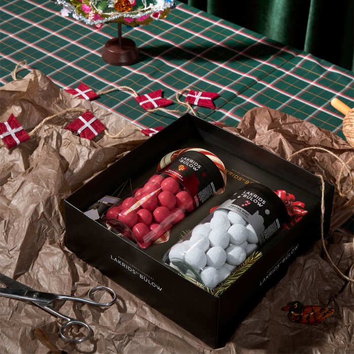 Lakrids by Bülow Black Box som innehåller Crispy Raspberry 270g och Small Frozen Mint 270g.