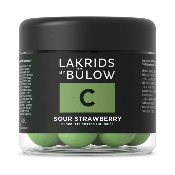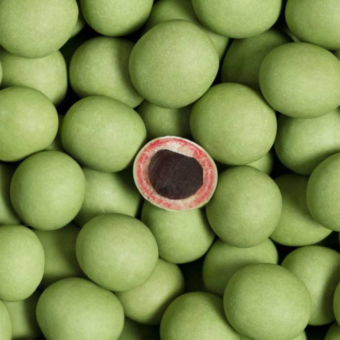 Föreställ dig läckra, nyplockade gröna jordgubbar tillsammans med seg, röd lakrits i en förförisk, fruktig mumsbit. Njut av hur friska och syrliga toner från krispiga, gröna jordgubbar balanseras perfekt med utsökt röd lakrits - allt omslutet av silkeslen vit choklad och ett krispigt, grönt sockerskal som ger en extra syrlig twist.