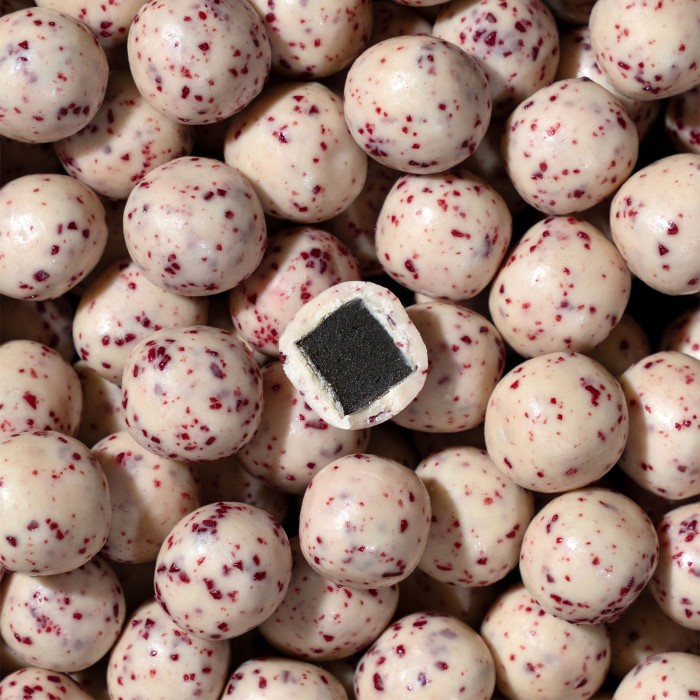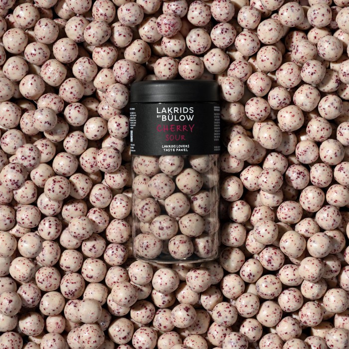 CHERRY SOUR kombinerar söt lakrits omsluten av krämig vit choklad med krispigt körsbärsgranulat vars lätta sprödhet ger en sensuell kontrast till den sammetslena konsistensen. Sötman från solmogna körsbär och den friska syran från mörka surkörsbär smälter samman i en harmonisk smakupplevelse som väcker minnen av barndomens bärplockning under soliga dagar.