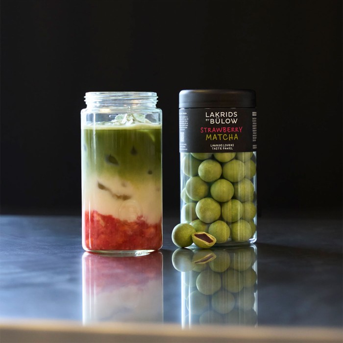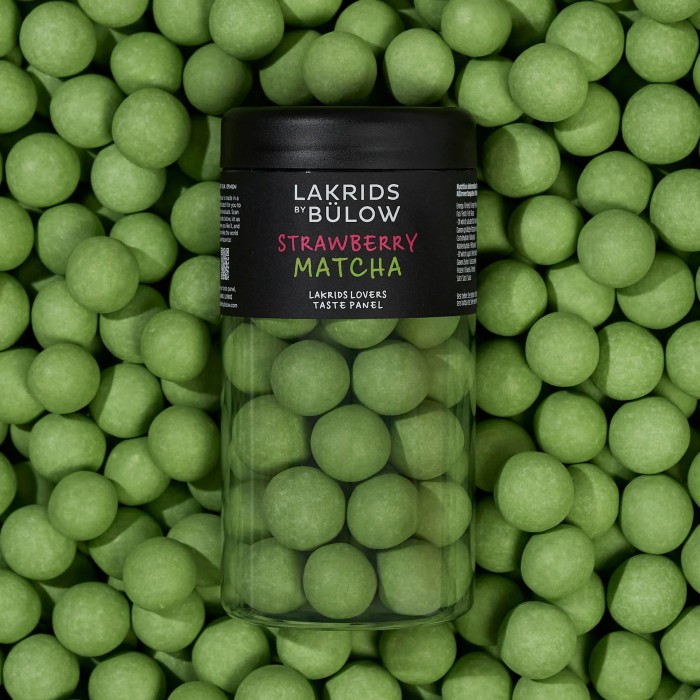 "STRAWBERRY MATCHA är en vidareutveckling av vår tidigare LAKRITS LOVERS-produkt MATCHA VANILLA LATTE: inspirerad av resor till Japan och den aktuella 'strawberry matcha'-trenden har vi förfinat mötet mellan grön, gräsig matcha och söta, solmogna jordgubbar. Produkten bygger på vår fruktiga röda lakrits, där matchans karaktär fortfarande framträder tydligt."