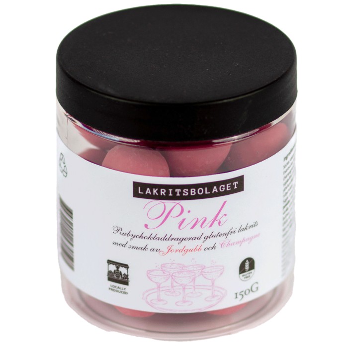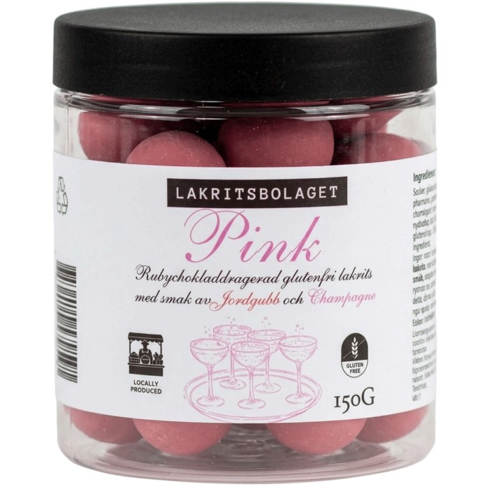 Socker, kakaosmör, sirap, SKUMMJÖLKSPULVER, majsmjöl, HELMJÖLKSPULVER, invertsocker, kakaomassa, lakrits (1,74%), salt, arom (naturlig vanilj, jordgubb, champagne) (0,47%), stabiliseringsmedel (E420), emulgeringsmedel (E322 SOJALECITIN), citronsyra (E330), konserveringsmedel (E202), ytbehandlingsmedel (kokosolja, E903). Minst 45% kakaotorrsubstans i rubychoklad. Kan innehålla spår av MANDEL och HASSELNÖTTER.