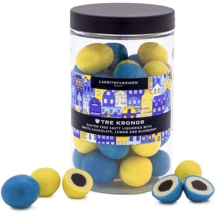 Upptäck Lakritsfabriken Tre Kronor Saltlakrits, en unik Sverigeprodukt med glutenfri saltlakrits täckt av vit choklad och smaksatt med citron och blåbär.