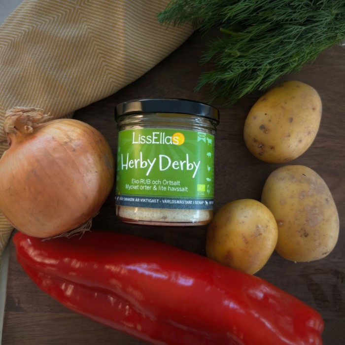 LissEllas Herby Derby Osötad Eko-Rub & Örtsalt är en ekologisk och osötad kryddblandning med tydlig karaktär av örter, vitlök och senapsfrö. Timjan, salvia och andra örter ger en rund och aromatisk smak medan vitlök och lök tillför djup. Svartpeppar bidrar med en mild värme som lyfter helheten.