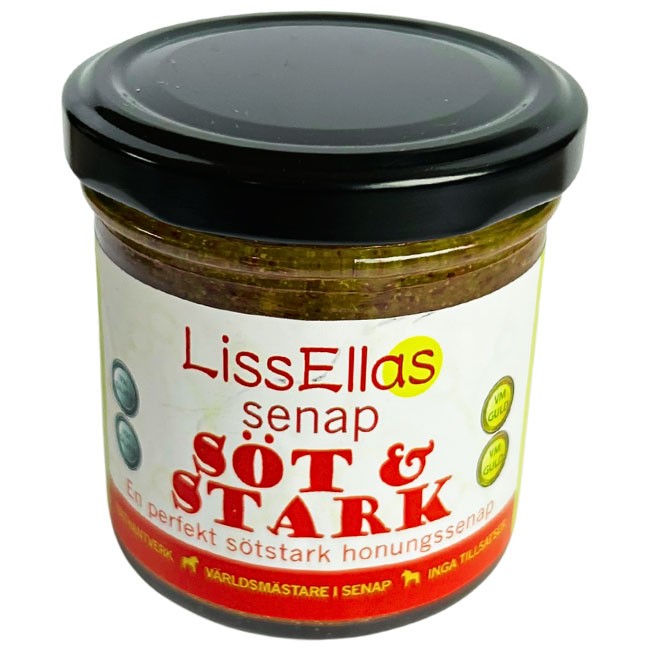 Smaka på en VM-medaljör! LissEllas senap Söt & Stark har prisats med både guld och silver på senaps-VM och vi förstår varför. Den smakrika senapen är välbalanserad och har en varm eftersmak av den söta honungen. En senap som funkar till det mesta, men den är extra god till chark, ost, grönsaker och grillat!