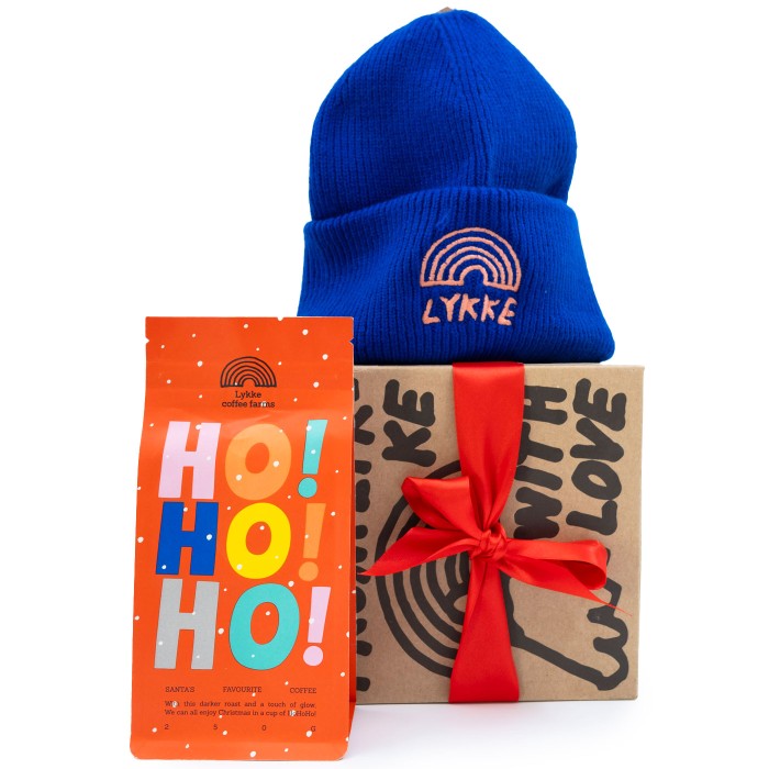 Denna presentbox innehåller HoHo 250 gram julkaffe (malet) och Lykke-mössa.