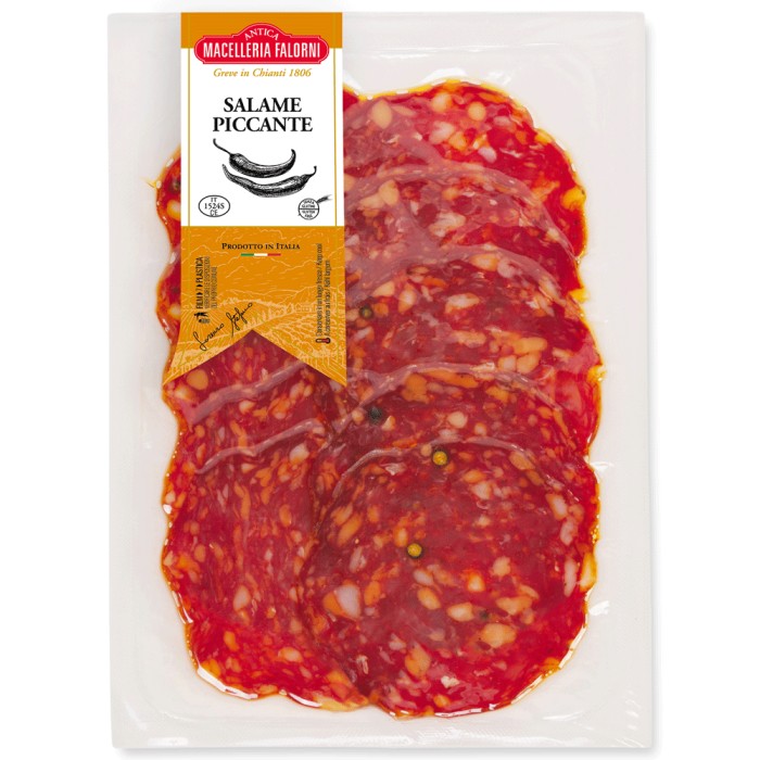 Macelleria Falorni Salame Piccante är en klassisk italiensk salami med en livlig och balanserad smakprofil. Kryddad med chilipeppar får den ett tydligt men behagligt sting som lyfter helheten utan att ta över.