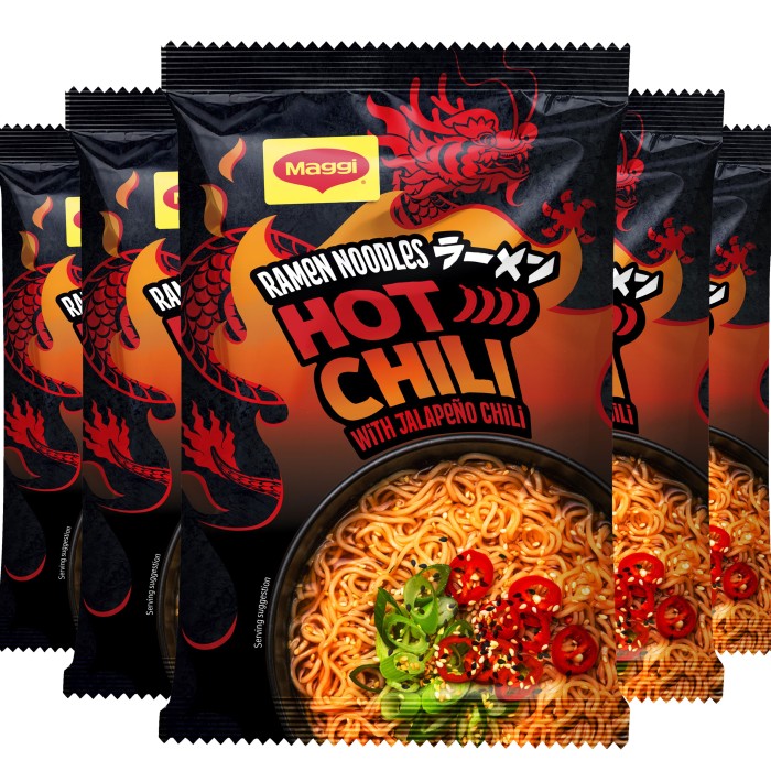 Maggi Ramen nudlar bjuder på en autentisk smakupplevelse som verkligen väcker dina smaklökar. Njut av den fylliga, söta smaken av hot chili med hetta från jalapeño. Med Maggi Ramen nudlar lagar du enkelt ett gott mellanmål på nolltid.