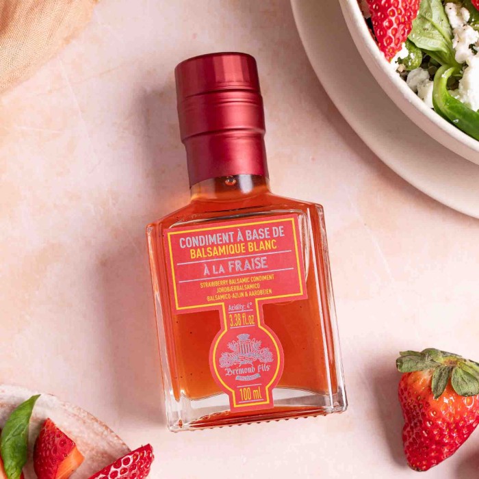 När jordgubbssäsongen står i blom lanserar Maison Brémond en exklusiv balsamico i limiterad upplaga – en fruktig och elegant vit balsamvinäger med smak av solmogna jordgubbar. Den milda basen av vit balsamico balanseras med äkta jordgubbspuré och naturlig arom, vilket skapar en frisk och harmonisk smakprofil med både sötma och syra i perfekt samspel.
