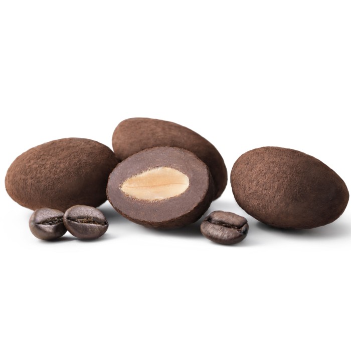 Rostade mandlar omslutna av fyllig mörk choklad med en elegant ton av kaffe. Den lena chokladen möter mandelns rika nötighet och kaffets aromatiska karaktär, vilket skapar en harmonisk och smakrik pralinupplevelse. Perfekt för dig som uppskattar en balanserad kombination av djup chokladsmak och subtil kaffofriskhet.