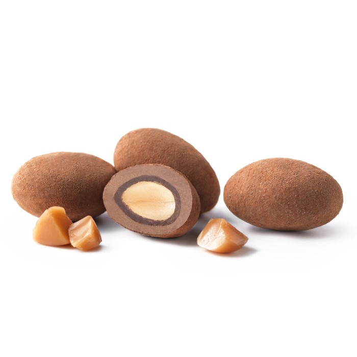 Rostade mandlar täckta med mjölkchoklad och fyllda med salt karamell. Kombinationen av krispig mandel, söt mjölkchoklad och lätt salt karamell skapar en balanserad smakupplevelse.