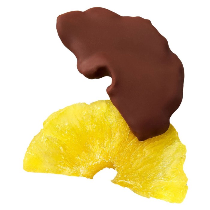 Ingredienser: torkad ananas (65%) (ananas, rörsocker, citronsyra), mörk choklad (35 %) (kakaonibs, rörsocker, kakaosmör).