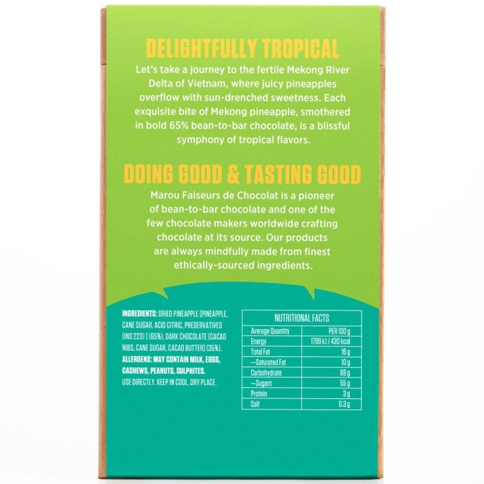 Mjuktorkad ananas täckt av Marous prisbelönta 65 % mörka Single Origin-choklad, en smakrik kombination av tropisk sötma och chokladens fylliga djup. Ananasen odlas i Vietnams bördiga Mekongdelta och har en naturlig balans mellan frisk syra och solmogen sötma.