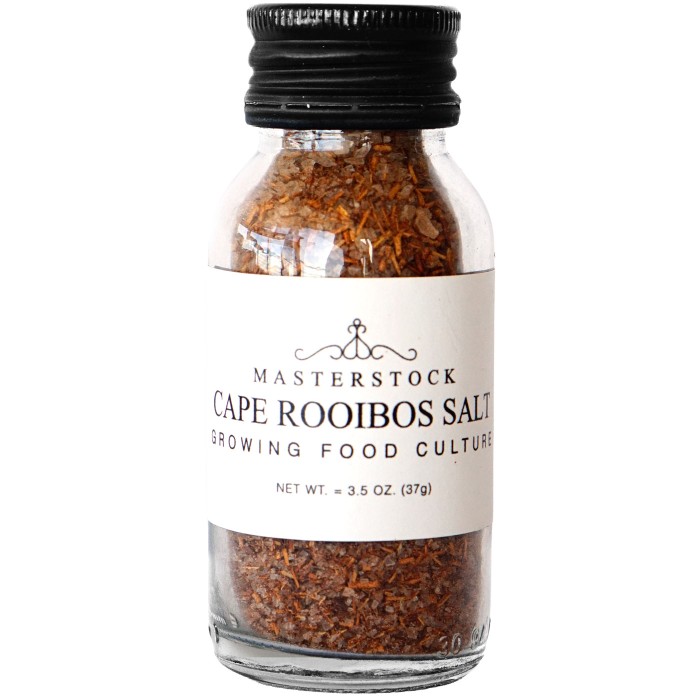 Masterstock Cape Rooibos Salt är ett exklusivt gourmetsalt framställt genom att grovt atlantiskt havssalt varsamt blandas med handskördad Cape Rooibos från Sydafrika. Kombinationen ger en unik smakupplevelse med subtila toner av rooibosens naturliga sötma och havssaltets friska mineralitet.